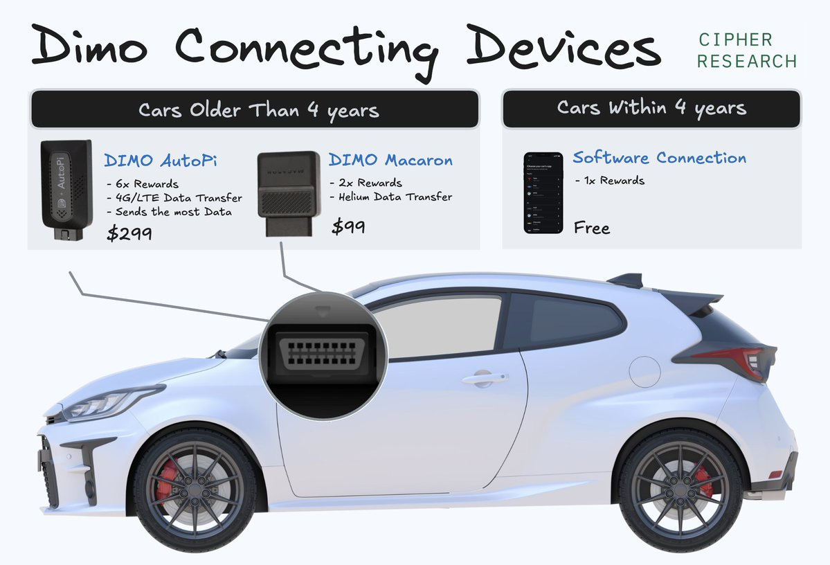 Cars can connect to DIMO either via hardware or software. For vehicles older than four years, a DIMO device needs to be plugged into the OBD port, which is present in all cars.
