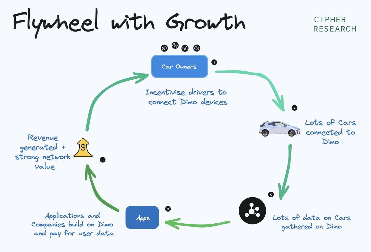 DIMO's flywheel mechanism is highly effective. It attracts car owners with rewards, accumulates extensive car data, and enables developers to build apps using that data, all of which contribute to the network's growing value.