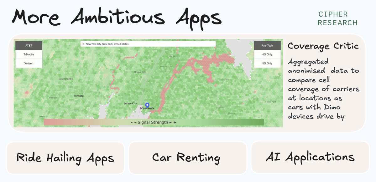 The DIMO network is already supporting innovative apps and services. For example, Coverage Critic has leveraged car data to build a detailed map of cell tower connections across carriers.