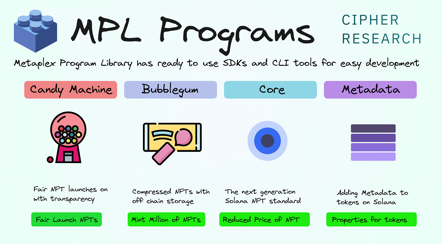 There's Core, which handles general NFT asset logic, and Bubblegum, which makes it possible to mint millions of compressed NFTs at a fraction of the cost.