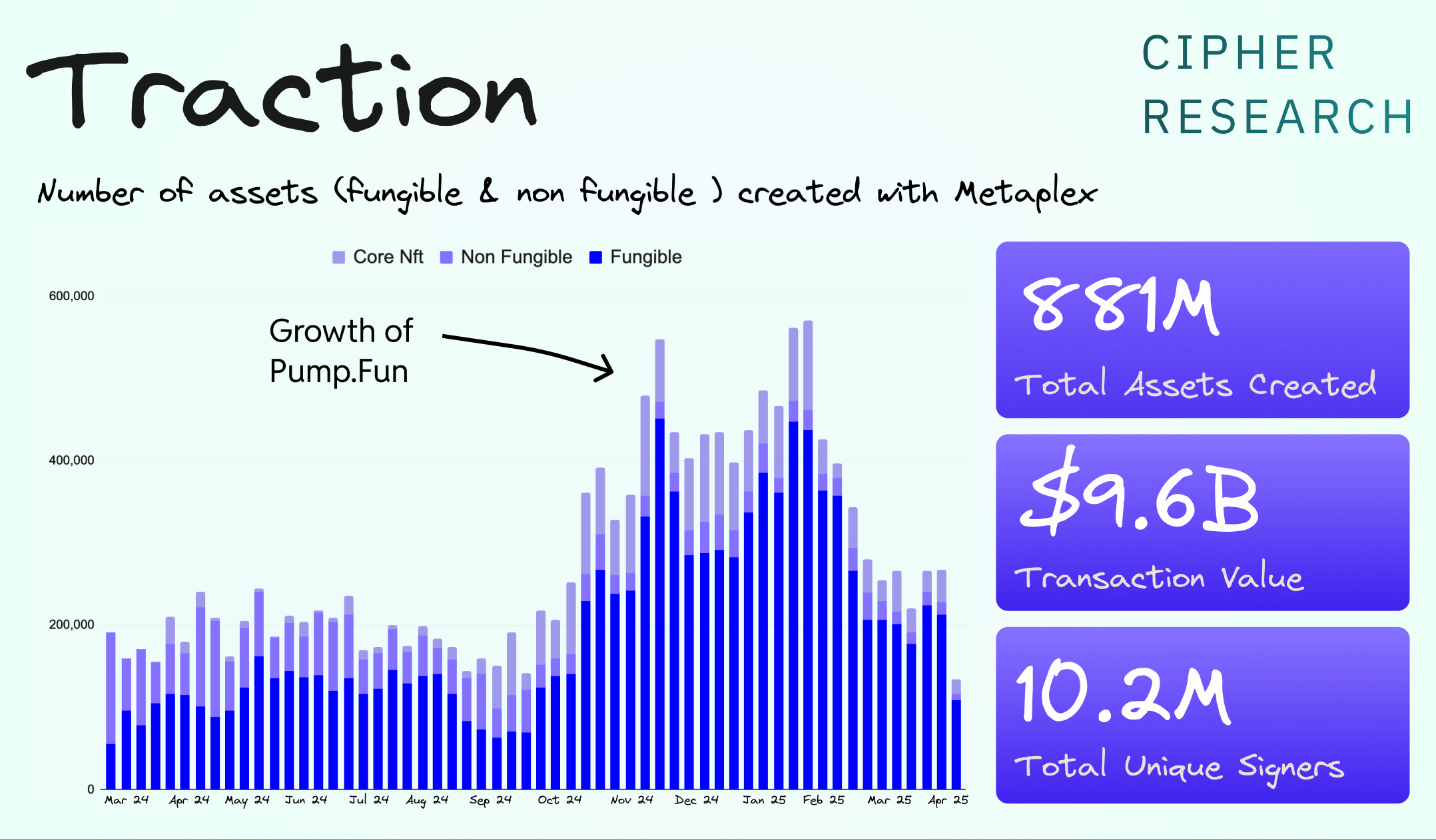 To date, Metaplex has helped mint over 880 million assets. It supports over 10 million unique signers, and more than $9.6 billion in transaction volume has passed through its protocols. Hundreds of apps rely on it every day. That’s how deeply embedded it is in the Solana ecosystem. And with the rise of platforms like Pump.fun, that momentum isn’t slowing down, it's multiplying.